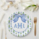 This topiary plate design features a very chic blue and green lattice patterned background with a coordinating blue and white striped bow. You can personalise with your monogram initials.