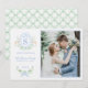 This Christmas Card has a preppy grandmillennial design featuring a blue reindeer crest at the top. The bottom has red text that says "Merry Christmas." You can personalise with a name, year and your initial. The back has a coordinating pattern blue and green trellis.