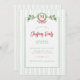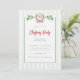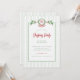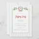 This Christmas party invitation has a preppy grandmillennial design featuring a Christmas wreath with a monogram letter at the top. The front and back have a coordinating scalloped pattern.