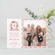 This Christmas photo card has a preppy grandmillennial design featuring a floral crest surrounded with berries an with a monogram letter in the center. The front and back have a coordinating damask pattern.