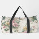 This image displays a duffel bag adorned with a richly detailed and elegant floral tapestry pattern, evocative of classic grandmillennial or vintage chintz aesthetics. The design features an abundant arrangement of blossoms in soft pinks, muted yellows, and subtle blues, intertwined with lush green and teal foliage, all set against a textured, antique white or cream background. The intricate details and sophisticated colour palette create a timeless and luxurious feel. Equipped with sturdy, dark-coloured straps and a secure zipper closure, this bag is a functional yet beautifully designed accessory, perfect for travel, gym use, or adding a touch of sophisticated, nostalgic charm to any ensemble.