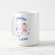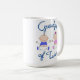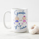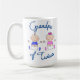 Cute coffee mug with "Grandpa of Twins" in blue and cute baby boy and girl in blue and pink clothes.