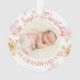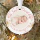 Custom photo ornament for grandparents first christmas. The design features snowflakes and a combo of handwritten and elegant typography in pretty shades of gold, blush peach and terracotta. The photo template is set up for you to add your new baby photo and you can also add the year and a message for their new grandchild on the back.