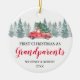 Rustic watercolor first christmas photo ornament featuring a simple white background, watercolor spruce trees, a vintage red truck, the words "first christmas as grandparents", the names of grandma & grandpa, and the year. On the reverse is a treasured picture of the grandchild.