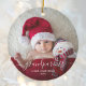 Help them celebrate their first grandchild with this beautiful modern keepsake ornament. The white text reads "Our first Christmas as grandparents," with the word "grandparents" in elegant handwriting script with flourishes before and after. Easily replace the sample image with your favourite photo of the new baby, and add his or her name and the year. A dark gradient filter helps make the text pop.