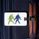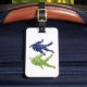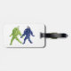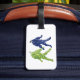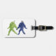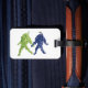 Grape Friends luggage tag. A pair of grape bunches, one green and one purple, walk companionably hand-in-hand. The stem of the green bunch seems to be looking at the purple bunch. The purple grape stem eagerly returns the glance.