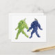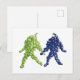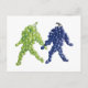 Grape Friends postcard. A pair of grape bunches, one green and one purple, walk companionably hand-in-hand. The stem of the green bunch seems to be looking at the purple bunch. The purple grape stem eagerly returns the glance.