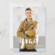 Stylish modern typography is featured in this graduation announcement / invitation that blends masculine style with contemporary clean lines. White text and bold 'grad' are set against a band of transparent grey allowing the background of your son's vertical senior portrait photo to show through. On the back, all text can be customised. Use as an invitation to a graduation party (as shown) or easily change the text to an announcement only.