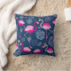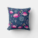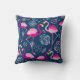 Graphic pattern of pink flamingos on a dark blue b cushion