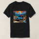 The image features a dynamic and adventurous scene with a bright blue off-road vehicle driving along a winding mountain road. The car, equipped with large tires and a roof rack holding red lights, has a rugged, sporty look, perfect for exploring rough terrains. The background showcases a stunning landscape of snow-capped mountains, a setting sun glowing behind the peaks, and a colourful sky in shades of orange, purple, and pink. Pine trees and rocky terrain frame the road, enhancing the sense of adventure and exploration. The overall design has a vibrant, cartoon-like style, making it perfect for a t-shirt that captures the spirit of road trips, outdoor adventures, and exploration. This design would appeal to those who love the thrill of the open road and the beauty of nature.