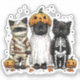 It's a charming illustration with three cute black pots dressed in classic Halloween costumes. From left to right, a cute cat is packaged as a mummy, a whimsical cat wears a laeken to be a ghost with a cut pump leg on its head, and a ghost-like nice cat is in a skeleton outfit. The scene is complemented by festive pumpkins and scattered autumn leaves, making it ideal for projects with a autumn and Halloween theme.