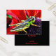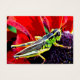 This brilliantly coloured Artist Trading Card features a shiny green, yellow and black grasshopper perched on the purple centre of a flower with gorgeous red petals.