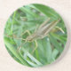 This pretty sandstone coaster features a detailed macro photograph of a small green grasshopper with brown mottled markings sitting on the grass. In the photograph you can see the detail of the jointed legs, long antennae and black and gold eyes of the grasshopper.