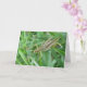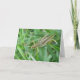 This customisable Birthday card features a detailed macro photograph of a small green grasshopper with brown mottled markings sitting on the grass. In the photograph you can see the detail of the jointed legs, long antennae and black and gold eyes of the grasshopper. The green text inside the card says, "Hoppy Birthday to you". The text is customisable so you can change it, add someones name to it or remove it to leave the inside of the card blank.