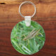 This brilliant keychain features a detailed macro photograph of a small green grasshopper with brown mottled markings sitting on the grass. In the photograph you can see the detail of the jointed legs, long antennae and black and gold eyes of the grasshopper.