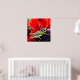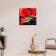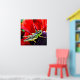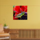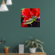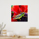 This brilliantly colored poster features a shiny green, yellow and black grasshopper perched on the purple center of a flower with gorgeous red petals.