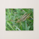 This awesome puzzle features a detailed macro photograph of a small green grasshopper with brown mottled markings sitting on the grass. In the photograph you can see the detail of the jointed legs, long antennae and black and gold eyes of the grasshopper.