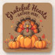 This charming Thanksgiving design features an adorable cartoon turkey with vibrant orange, red, and brown tail feathers perched atop a trio of plump pumpkins. Surrounded by whimsical falling hearts, autumn leaves, and warm seasonal colors, the artwork is framed by the joyful phrase “Grateful Hearts Gather Here” in bold, playful lettering. The illustration radiates a cozy, festive vibe perfect for celebrating gratitude, family, and togetherness during the fall season. Its cheerful and heartwarming aesthetic makes it ideal for spreading seasonal joy and capturing the magic of Thanksgiving gatherings. Whether displayed in a home setting or shared as a thoughtful seasonal gesture, this playful composition adds a lighthearted, seasonal charm. AI generated artwork.