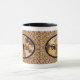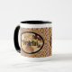 Autumn leaves and the word, "Grateful" are framed with a black oval and swirled and tiled autumn leaves on this mug.