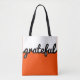 Modern and simple Orange Black White colour block tote bag featuring grateful script lettering. Perfect to create an atmosphere of positivity and gratitude while you are out and about. Ideal for anybody who practices law of attraction, abundance, manifesting and who wants to focus on all the blessings and positive aspects of life.