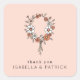 This wedding sticker features a charming floral wreath design on a soft peach background, creating a warm and inviting atmosphere. The wreath is composed of delicate white flowers with orange centres, accented by slender greenish-grey leaves, arranged in a symmetrical circular pattern. Below the wreath, elegant sans-serif typography reads "thank you" followed by names in a bolder style, adding a personal touch to this celebration-themed sticker. Perfect for expressing gratitude at weddings or special events, its whimsical and vintage-inspired aesthetic evokes feelings of nature and simplicity.