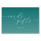 This wedding tabletop sign features a minimalist design with a gradient background transitioning from deep teal to light turquoise. The elegant cursive typography spells out "cards and gifts," while the simple sans-serif font below reads "THANK YOU." The clean, modern aesthetic emphasizes gratitude and sophistication, making it perfect for expressing appreciation at your special event. Its contemporary style and soothing color palette create an inviting atmosphere, ideal for any wedding celebration.