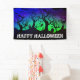 Graveyard black, blue and green Halloween banner, featuring a cemetery with spooky trees, graves, crosses, skulls, a witch, an owl, bats, a black cat, clouds and the text "Happy Halloween" on blue and green background.