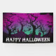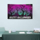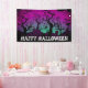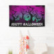 Graveyard black, purple and turquoise Halloween banner, featuring a cemetery with spooky trees, graves, crosses, skulls, a witch, an owl, bats, a black cat, clouds and the text "Happy Halloween" on purple and turquoise background.