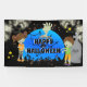 A super cute Halloween design featuring a little boy and girl Zombie standing next to a blue full moon that has a hand breaking through the ground and a cobweb with a spider on it. A tombstone reads RIP and a spooky fog is rolling across the graveyard. This fun and eye catching banner says "happy halloween" at the bottom and is ideal for all kids halloween party celebrations, corporate events or birthday parties.