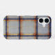 This phone case features a sophisticated plaid design in gray, navy, and orange tones, highlighted with elegant gold accents. Perfect for those who love timeless patterns with a modern touch.