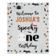 Cute modern boys Halloween first birthday welcome sign in orange brown, black and gray color. This design features a cute ghost, spiders, bones, stars and bats on a gray background. This boys spooky one Halloween themed first birthday welcome sign is ideal for an October birthday party.