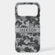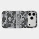 Customize this gray camouflage iPhone 17 pro max case with your name in a trendy modern CAP font in dark gray on light gray. It's masculine and perfect for your favorite military, hunting, country or outdoorsman!