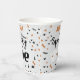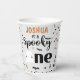 Cute modern boys Halloween first birthday paper cup in orange brown, black and gray color. This design features a cute ghost, spiders, bones, stars and bats on a gray background. This boys spooky one Halloween themed first birthday paper cup is ideal for an October first birthday party.