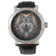 This black-band watch showcases a captivating gray wolf portrait. It is designed to appeal to enthusiasts of wildlife, nature, and wolves. This piece is an AI art creation by Susang6.