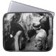 GRAYSCALE PHOTO OF MEN STANDING BESIDE 60163 TRAIN LAPTOP SLEEVE
