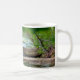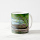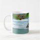 A beautiful scene of a great blue heron on the shoreline on these awesome coffee mugs.
