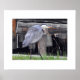 In the original photograph by ZoeSPEAK in this Print, the Great Blue Heron, standing along the bank of a canal, seems to be noticing something farther up the waterway, a possible threat to his territory. He puffs up the bluish grey feathers on his back to make himself look bigger. With his long, thin legs spread and his head and beak turned to the side, the bird almost looks like someone on a subway platform, waiting for a train. Dark, rippled reflections on the water form the background of the scene. There is a wide white border around the photograph, with title and photographer's credit in small text under the photo.