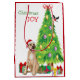 On each side of this Holiday gift bag, a Great Dane Dog wears a red and white Santa hat while he sits beside a Holiday tree. Around the dog brightly wrapped gift packages are scattered about. A bullfinch is landing on the Christmas tree. The red and green text says "Christmas JOY".
