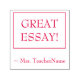 This motivating rubber stamp design features the motivating feedback message "GREAT ESSAY!" and a personalised teacher name. It could be used by a teacher, educator, or tutor when grading student work, to indicate that a student has done an exceptional job.