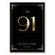 Great Gatsby Art Deco wedding table number cards with golden number 91 and changeable text, where you can add your names and wedding date, printed on black background