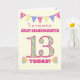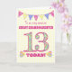 A pretty 13th Birthday card for your great granddaughter, with polka dot bunting, primrose flowers and numbers filled with a primrose pattern, all on a pale yellow check gingham background. The front cover message is, 'To a very special GREAT GRANDDAUGHTER 13 TODAY!' The inside message is just a suggestion and you can easily personalise it or delete it if you prefer.