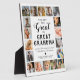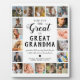 Personalised great grandmother photo plaque featuring the cute saying "you put the great in great grandma", 18 pictures of the grandkids, their names, and the sweet caption "grandmas hold our tiny hands for just a little while, but our hearts forever".