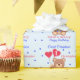A cute 1st birthday teddy bear gift wrap for a great grandson with a watercolor cartoon teddy bear and heart balloons with the birthday age. All on a blue polka dot/ confetti background A sweet design for a little boy who will be one years old. Add the child,s name and age to customise it for that special baby boy. All text can be amended as needed to customise.