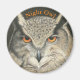 A colour pencil and pen drawing of a Great Horned Owl with piercing orange eyes.