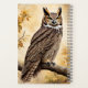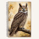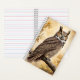 A majestic great horned owl is perched in a tree, surrounded by brown autumn leaves, on a neutral sandy background, Beautiful notebook, and perfect for anyone who loves owls, birds, nature, and the outdoors.