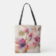 Tote bag depicts a beautiful floral watercolor including elegant pink and lavender flowers and greenery on a light gold background. It features the beloved Christian Hymn, "Great is Thy Faithfulness."
