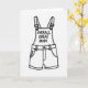 This card features a black-and-white drawing of a pair of short overalls centred on a plain white background, with thick dark outlines that give it a crisp, graphic look. The straps, small buckles, waistband, and roomy pockets are simplified, making the outfit feel like a familiar favourite that someone might wear while giving a quick, affectionate hug ❤️. Across the bib area, the message “OVERALL GREAT MOM” is written in dark, hand-drawn lettering that sits front and centre, like a friendly note meant to be noticed right away. Dashed lines trace the seams and edges to suggest stitching, adding a gentle, cosy touch—like care shown in the little details 🌼. The strong contrast between the dark lines and the open white space keeps everything easy to read and lets the overalls stand out confidently. The wordplay reads like a teasing compliment, the kind you’d share with a mum who smiles back and squeezes your hand a little tighter. The layout stays vertical and balanced, with the overalls filling most of the frame and the text spanning the bib in dark ink. Small dashed stitches run along the straps, pockets, and leg openings, forming neat rows around the garment’s edges.