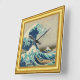 Vintage Wall Clock featuring famous artwork "Great Wave off Kanagawa" by Katsushika Hokusai framed in golden picture frame. Beautiful Japanese painting and certainly one of the most picturesque representation of Japan. With snowy Mount Fuji peaking in the background.