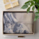 Vintage illustration fine art maritime design featuring a seascape of huge crashing tidal waves with boats of people and Mount Fuji in the distance. Although assumed to be a tidal wave, it is more likely an okinami, or large wave.