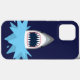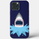 Cute cartoon of a great white shark leaping from the waves with its toothy jaws wide open.